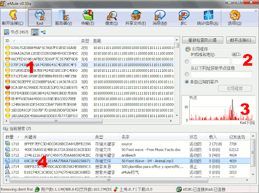 Kad窗口允许你查看eMule(电骡)提供的无需服务器的Kad网络。除了图示的区域(2)外,窗口内所有项目都仅供查看之用。如你仅对Kad提供的传输感到欣慰而不想为细节困扰的话,你无需花心思在它们上面。